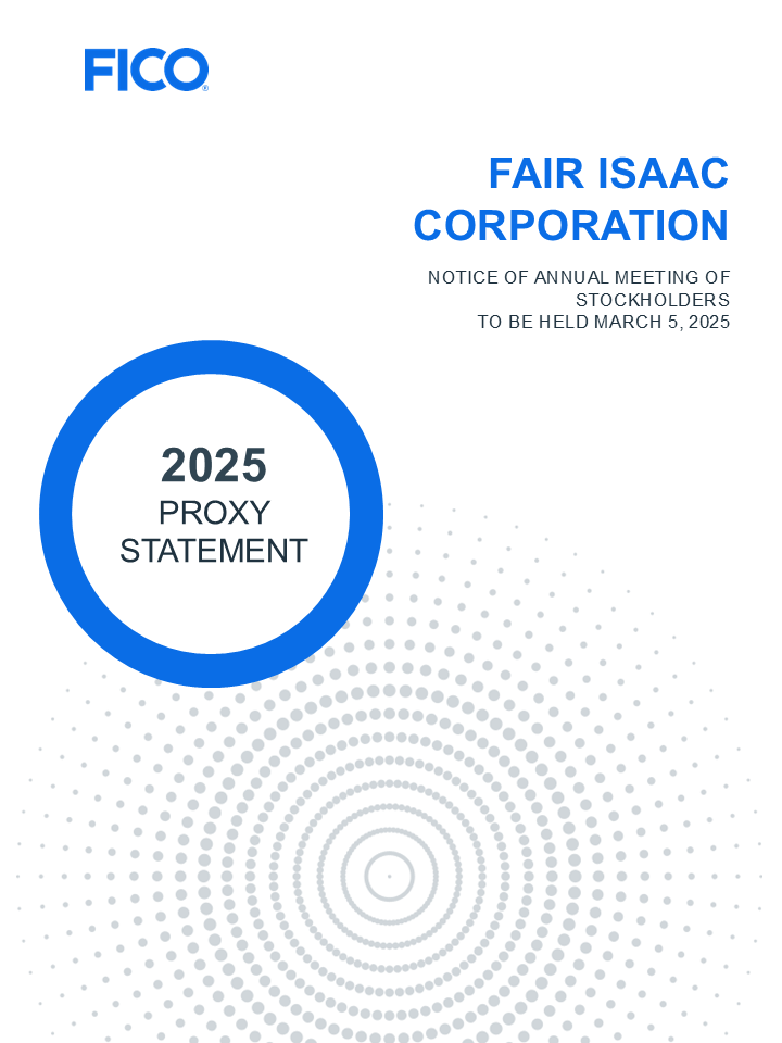 Against this performance backdrop, it is our pleasure to invite you to attend the 2025 Annual Meeting of Stockholders of Fair Isaac Corporation at our San Jose, CA office on Wednesday, March 5, 2025, at 9:30 a.m. Pacific Time. At this year’s meeting, we will vote on the election of directors and the ratification of the selection of Deloitte & Touche LLP as FICO’s independent registered public accounting firm. We will also conduct a non-binding advisory vote to approve the compensation of FICO’s named executive officers. Finally, stockholders will have an opportunity to ask questions.